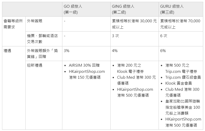 - 升級成為第二級「Ging級旅人」後,在會籍 12 個月的有效期內,累積滿等值港幣$70,000外幣簽賬【只計算實體店】
